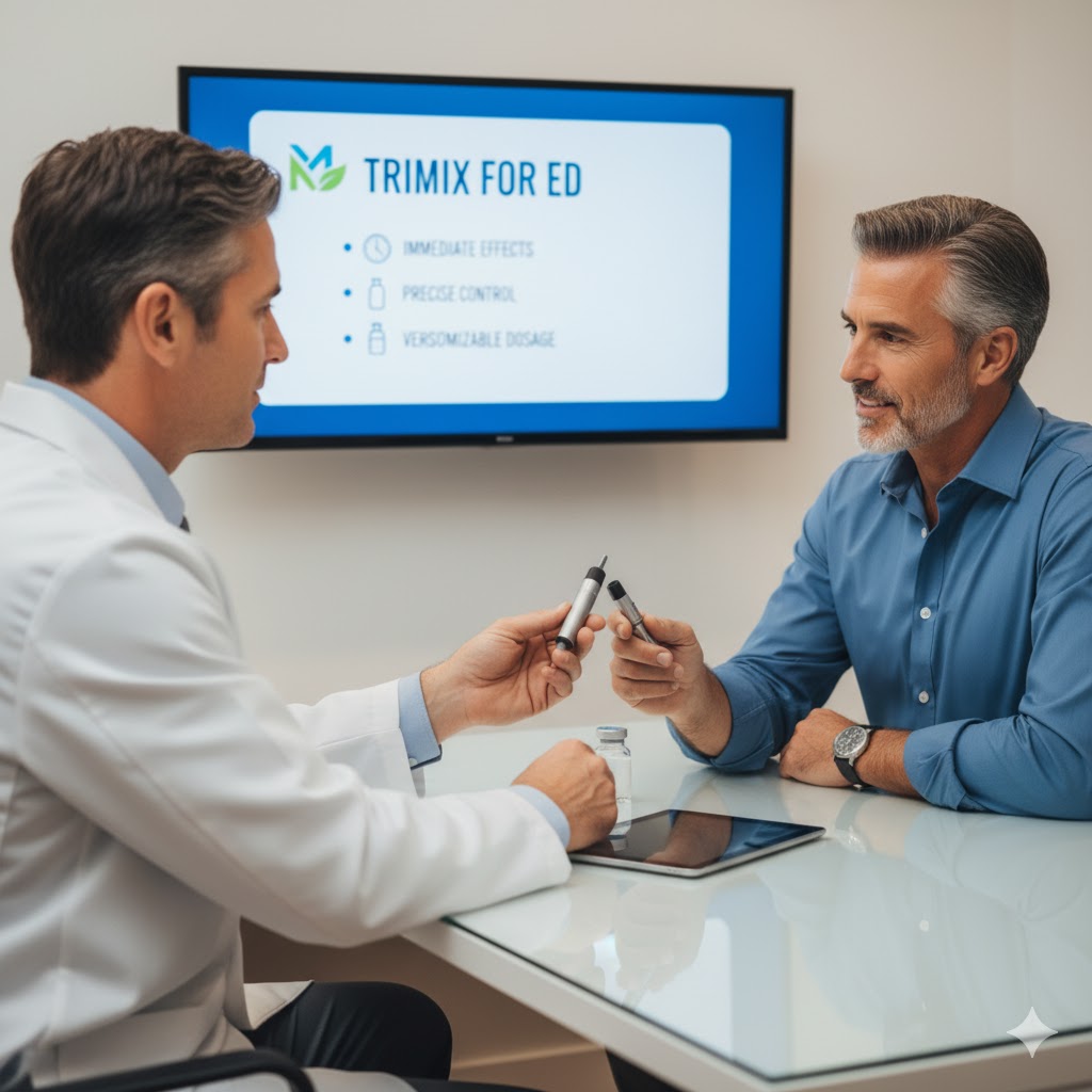 Trimix therapy is an effective injectable medication used for treating erectile dysfunction (ED) that combines three active ingredients: papaverine, alprostadil, and phentolamine. This mixture is injected directly into the penis and enhances blood flow, allowing men to achieve and maintain an erection more easily. It is often used as an alternative for patients who have already tried oral medications for ED, such as Viagra or Cialis, without considerable results. It is also beneficial for individuals who can’t risk any side effects due to issues with their health or medical history, like diabetes, cardiovascular diseases, or prostate surgery.